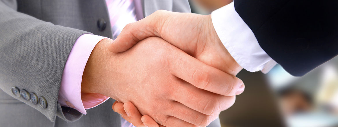 Two business professionals in suits shaking hands in a confident and positive manner, suggesting a successful corporate agreement or partnership. The background is a blurred office environment, conveying a formal and professional setting. The emotional tone is trustworthy and optimistic.